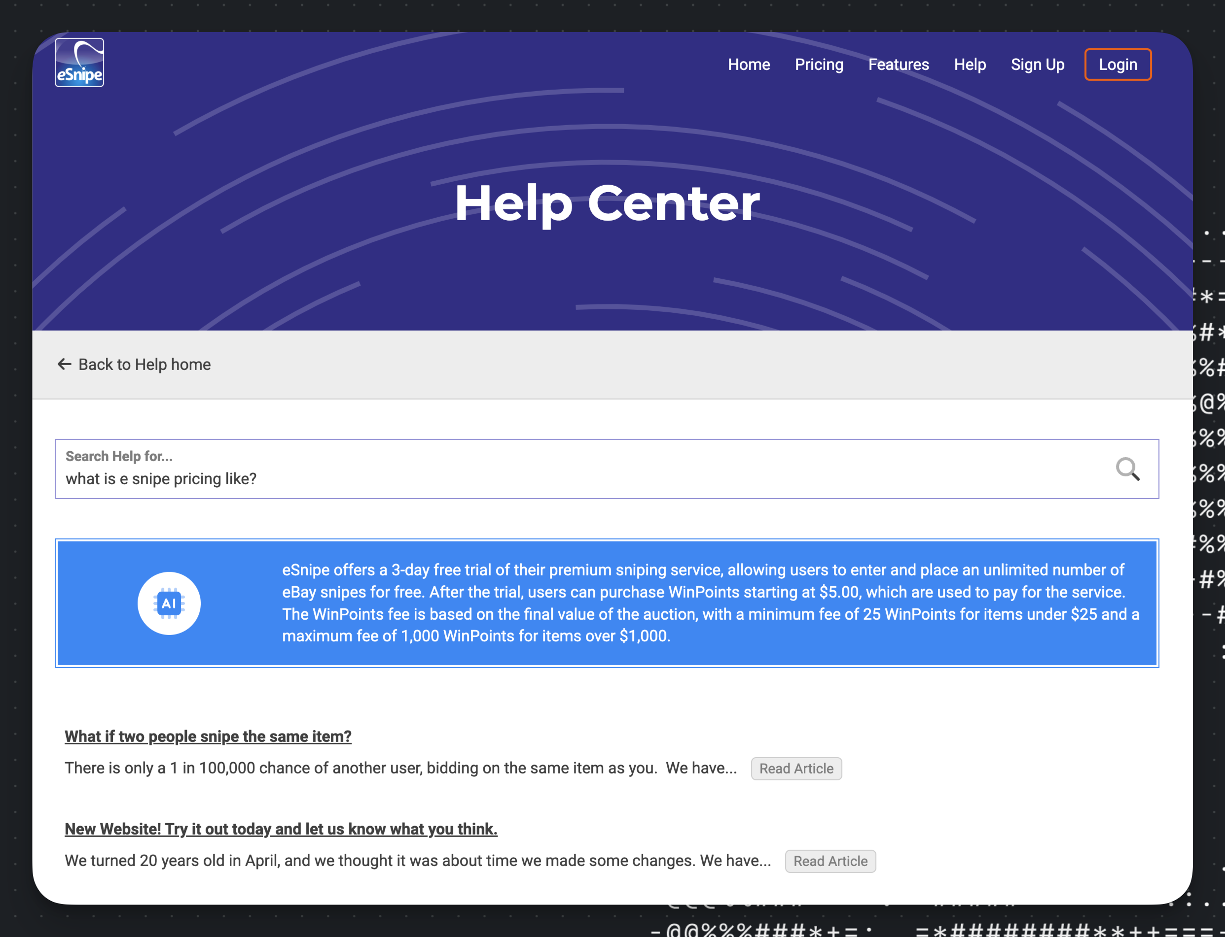 Through all these available APIs, customers like eSnipe have been able to deploy Voiceflow AI solutions in creative form factors like an AI enhanced search box, helping them automate 70% of their help center tickets.