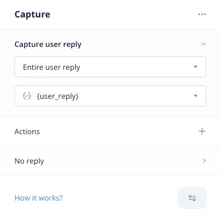 Capture user input using a Capture step and map the entire user’s reply to the {user_reply} variable.