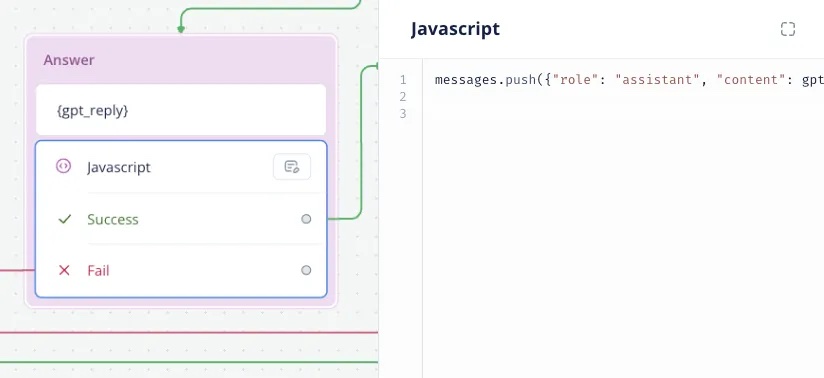 Then use a Javascript Step below to initiate the variables and push the first content to the {messages} array.