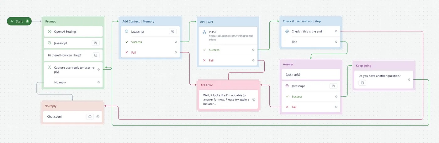 Loop back to the Capture step to allow the user to ask another question or end the conversation if gpt_reply is “1”.