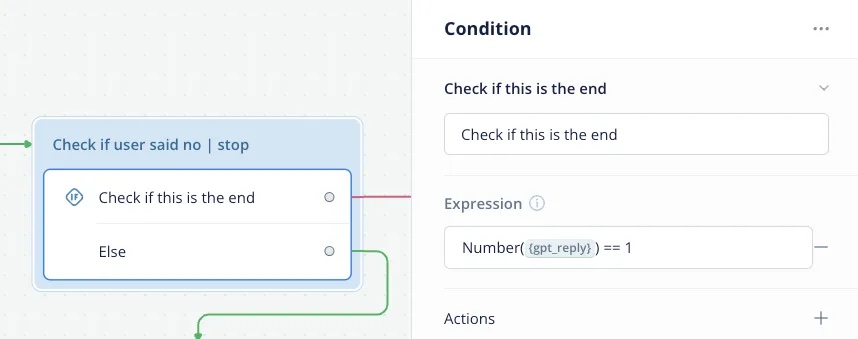 Create a condition step to check if the gpt_reply value is equal to “1.” If it is, this indicates that the user wants to stop the conversation, and the skill should respond with a farewell message like “Chat soon!”