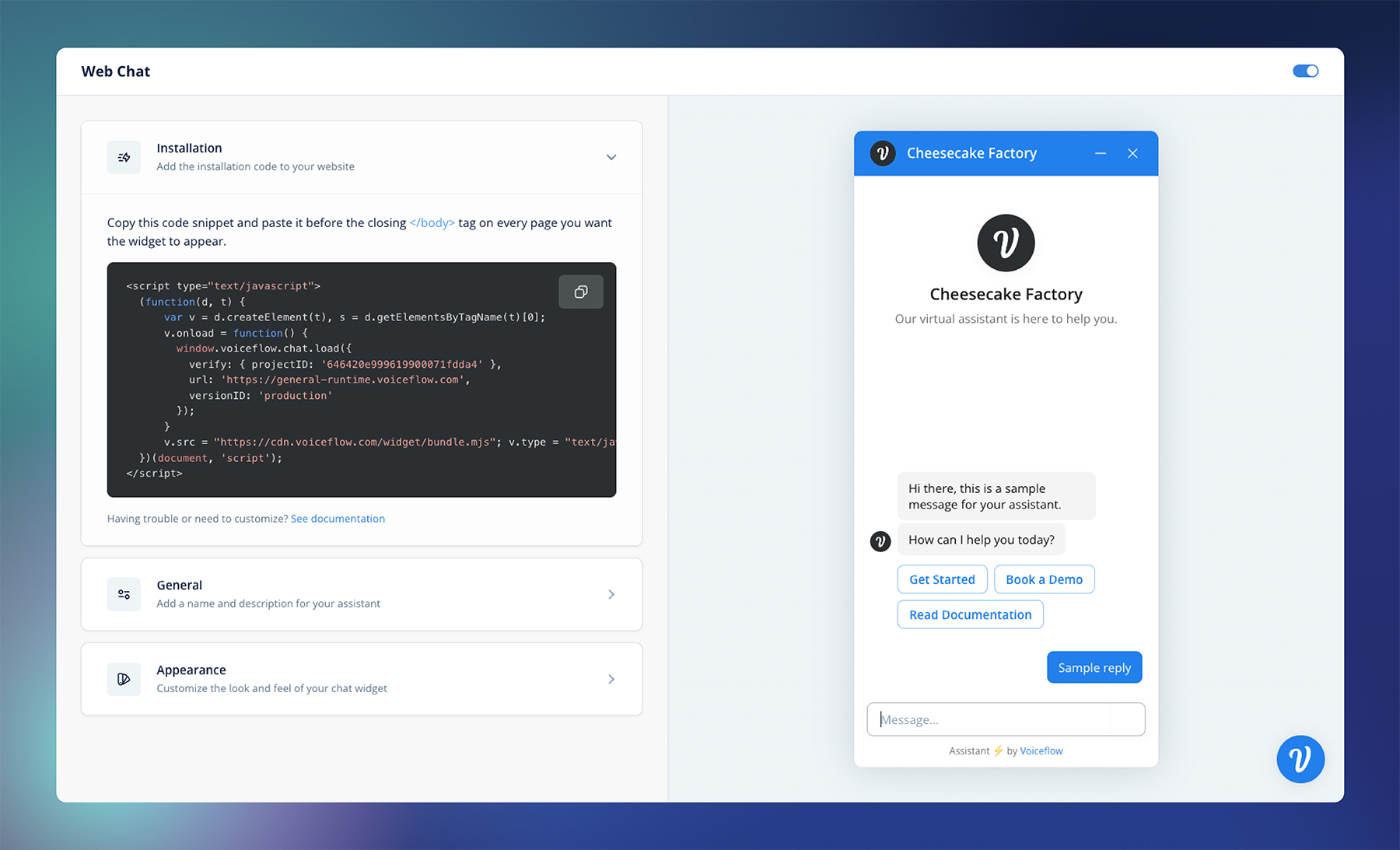 3. Push it live and invite your customers. Ready to deploy your assistant? Hit publish, copy your code snippet, and drop it into the <body> tag of your website. A similar process can be followed to deploy your assistant on a supported channel, such as WhatsApp, Twilio SMS, or Microsoft Teams.