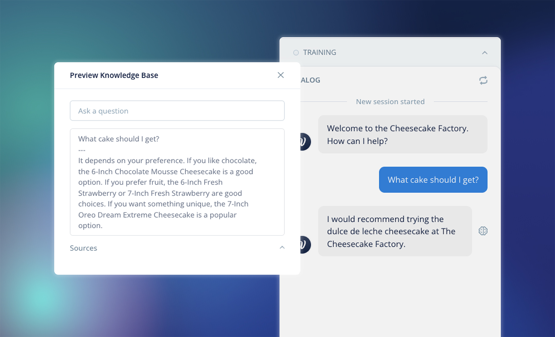 For this example, we couldn't think of a better restaurant menu to tackle than the Cheesecake Factory's textbook-length menu. If you want to make a restaurant menu bot that helps customers make a decision, upload a menu into your Knowledge Base data source. Here's how our own Peter Isaacs tackled the Cheesecake Factory menu: