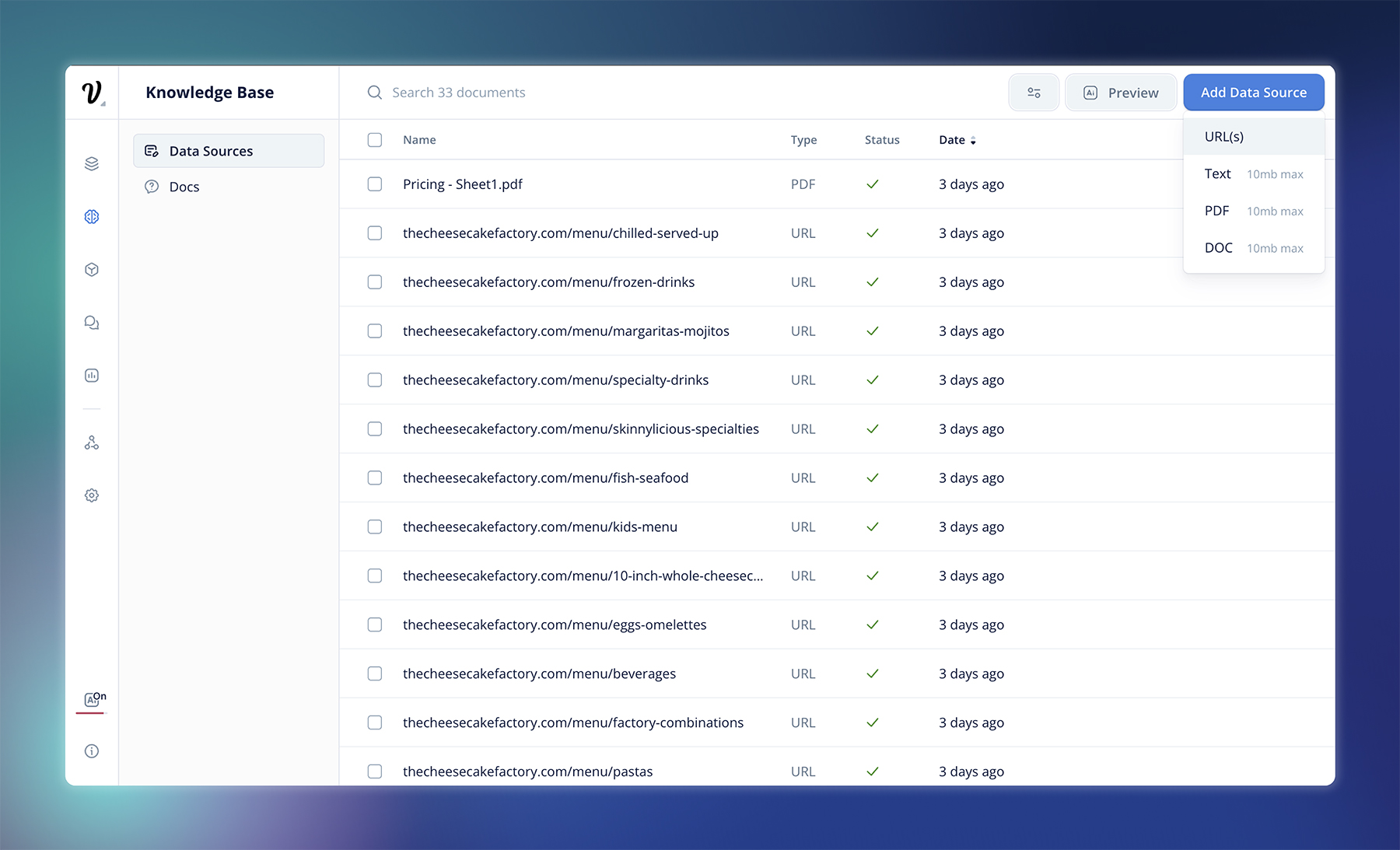1. Connect your company’s knowledge base. Upload PDFs, text files, and/or URLs to your Knowledge Base data source.