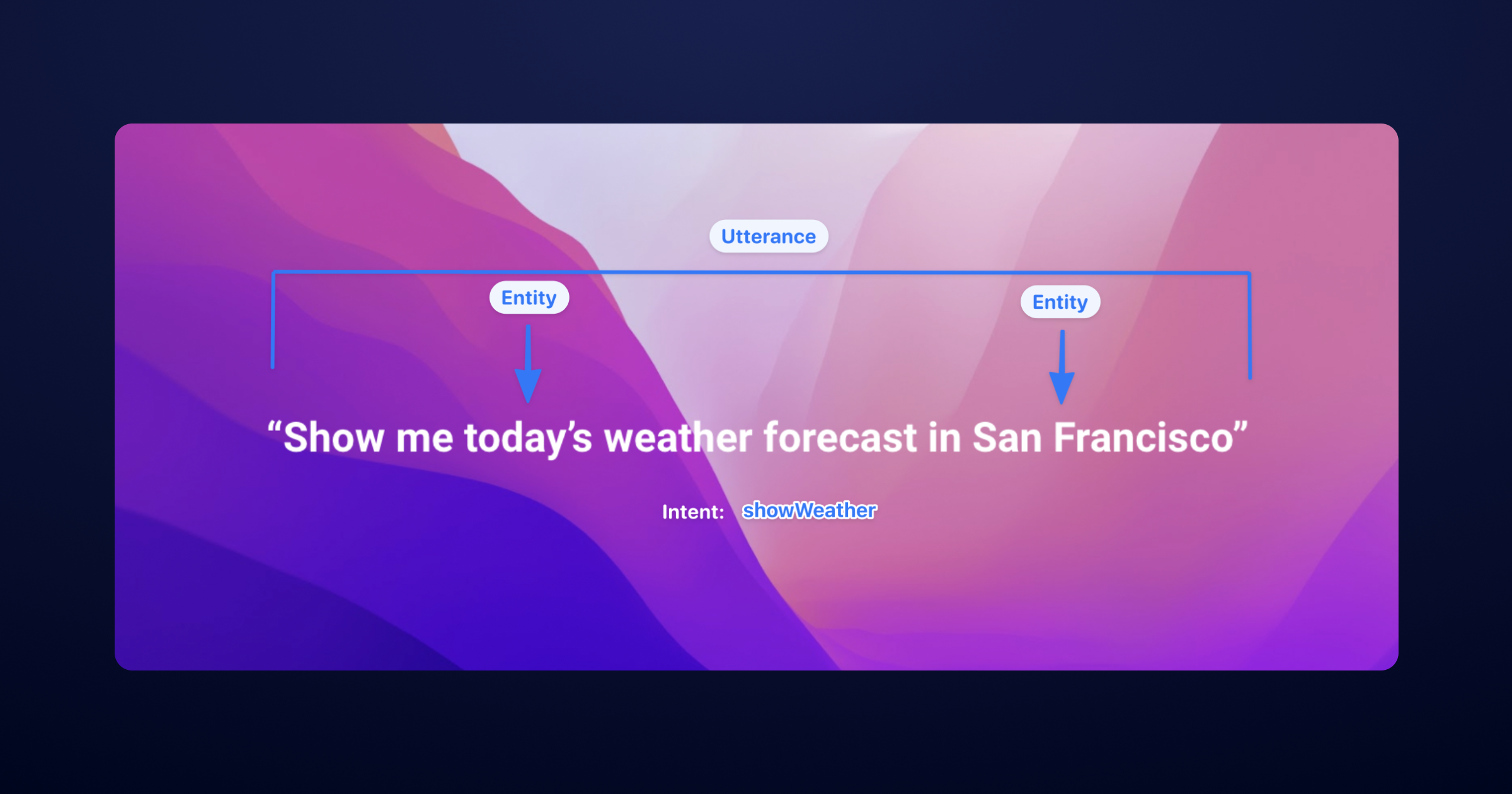 In the “Show Weather” intent, you’ll have the “Show me today’s weather forecast in San Francisco” as an utterance for the machine to interpret. Based on the intent, the machine knows it needs to show the weather for a place and for a date. Based on the entities in the utterance being “today” and “San Francisco”, the machine now know’s to look at the weather report for today, in San Fransisco.